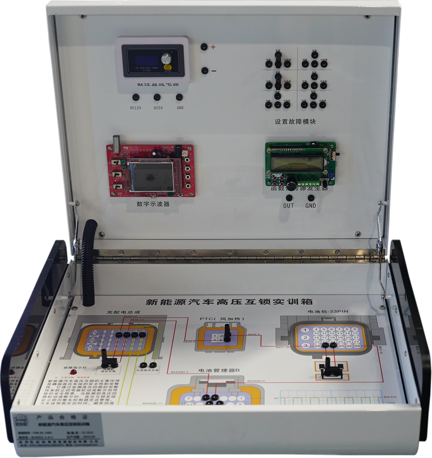 1.互鎖類型采用PWM信號(hào)和線性電壓相結(jié)合。2.實(shí)訓(xùn)箱能實(shí)現(xiàn)互鎖的斷路、短路的故障設(shè)置,各類型故障不少于3個(gè)故障設(shè)置點(diǎn),且配備檢測(cè)端口,便于教學(xué)3.實(shí)訓(xùn)箱檢測(cè)面板包含有互鎖控制原理4.實(shí)訓(xùn)箱檢測(cè)面板需含BMS 26pin結(jié)構(gòu)圖、動(dòng)力電池包33pin結(jié)構(gòu)圖、充配電總成33pin結(jié)構(gòu)圖5.實(shí)訓(xùn)箱具有兩種供電系統(tǒng),自身供電與外接交流220V供電6.實(shí)訓(xùn)箱配套數(shù)字萬(wàn)用表核心功能包含不限于:交直流電壓測(cè)量、
